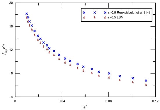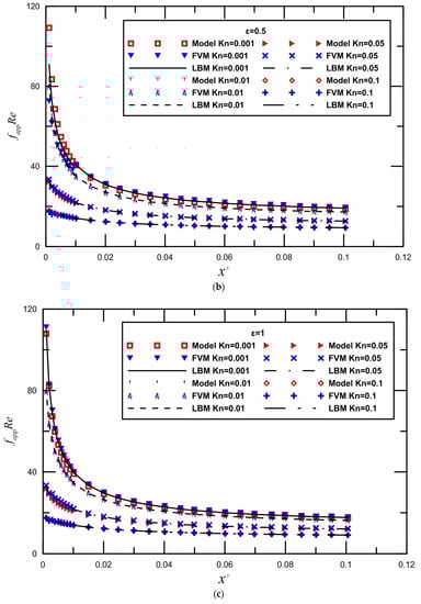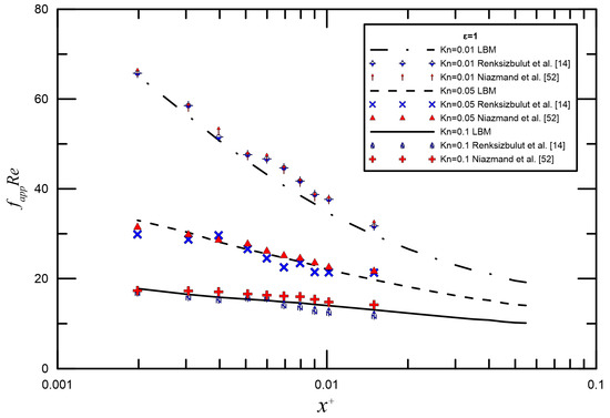 Slip flow in the entrance region of rectangular microchannels was investigated numerically by Renksizbulut et al. [14] and Niazmand et al. [52]. Figure 4 and Figure 5 demonstrate the comparison between LBM reports and the numerical data by Renksizbulut et al. [14] and Niazmand et al. [52] for different Knudsen numbers. Good quantitative agreement was observed between the simulations and previous numerical data from [14,52]. The maximum deviation is generally less than 10%.