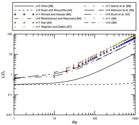 Several hydrodynamic entrance length studies have been explored both experimentally and numerically. Regarding numerical studies for rectangular ducts and parallel plate channels, results found by groups, such as Han [54], Fleming and Sparrow [55], Atkinson et al. [56], Wiginton and Dalton [57], and Chen [58], are considered to relatively standardly and accurately analyze the entrance length. Many entrance length studies for circular ducts have also been investigated by some groups, such as Sparrow et al. [59], Goldstein and Kreid [60], Beavers et al. [61], and Muchnik et al. [62].