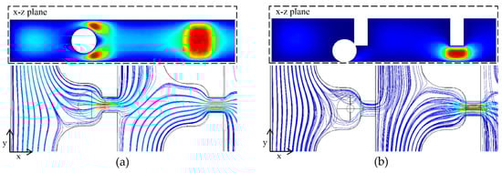The fluid flow through two consecutive capture sites with varying height of the trapping channels was studied using COMSOL™ 5.2 (COMSOL, Inc., Stockholm, Sweden) to study the hydrodynamic conditions and correlate with the device performance. Figure 2a,b shows the velocity field and streamlines of the LR-type referring to the trapping channel height of 30 μm and the fVR-type referring to the trapping channel height of 10 μm. The preceding capture sites were designed to be occupied by the spheres 18μm in diameter. It can be seen that the number of streamlines to the occupied capture site were drastically decreased in the fVR-type compared to the LR-type, indicating less possibility of multi-cell capture. The number of streamlines refers to the volumetric flow rates (Q) which could be calculated by surface integration of the cross-section, and the relationship between the Q ratio (Q trap/Q bypass) of the occupied and the vacant sites for a trapping channel height of 10 to 30 μm was numerically analyzed (Figure 2c). As can be seen, the Q ratio of the occupied capture site was proportional to that of the vacant capture site; however, its slope depended on the trapping channel height forming three groups compared to the captured particle size. Furthermore, the pressure difference across the capture site was also analyzed considering that cells could be deformed and escape through the trapping channel depending on the applied hydraulic pressure. With the Q ratio at the vacant site and the flow rate from the inlet being constant, the pressure differences of both occupied and vacant capture sites exponentially increased as the trapping channel height decreased (Figure 2d).