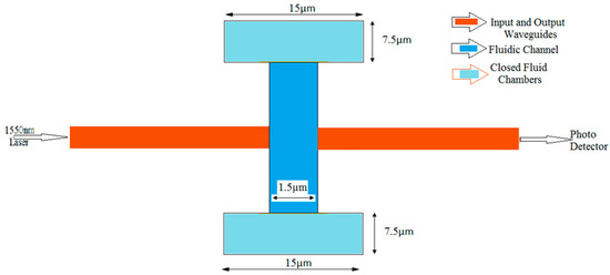 Figure 1 shows schematic of an integrated opto-fluidic biosensor employed for modeling and simulation. It consists of a laser source at 1550 nm, photo detector and SOI input and output waveguides (shown in red) with a narrow fluidic channel (shown in blue). In the operation, the optical power is coupled into the input waveguide by using laser source (1550 nm). The guided modes propagate through the input waveguide and couples into the fluidic sensing region. When the light couples from input waveguide to the output waveguide through the fluidic sample the absorption of optical power occurs due to the properties of the microparticles present in the fluidic sample. Based on the fluidic gap distance, a mode mismatch occurs between fluidic gap and input waveguide. Mode mismatch occurs due to the absorption of optical power [18], in fluidic gap. Hence, mode mismatch which occurs during propagation of light through sensing region (fluidic gap distance) and absorption of optical power by the analyte is used for the purpose of analysis and also as a designing tool.