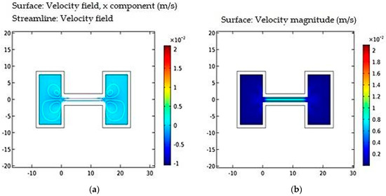 Figure 3a, shows a graph of streamline velocity field with respect to channel length. Figure 3b shows a graph of velocity magnitude with respect to channel length. In the steady state there is no net flow through the channel, but a flow parallel to the walls, in the direction of the thermal gradient (cold to hot), develops due to thermal creep. In order to compensate for this flow, a back flow develops in the center of the channel, which is driven by a pressure gradient in the fluid. It results in a continuous flow of fluidic sample in the narrow microfluidic channel. This is achieved by maintaining a constant pressure of 1 Pascal at the center of fluidic channel.