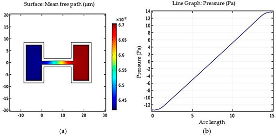 Figure 4a, shows fluid mean free path. Such rarefied flows are characterized by a parameter known as the Knudsen number, which is the ratio of the mean free path to the characteristic length of the geometry. Figure 4b, shows the relative pressure acting on the channel wall, as a function of position along the wall.