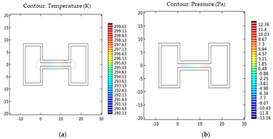 The microfluidic channel shown in Figure 2 is used to compute the flow between two sealed chambers (closed fluid chambers) connected by a micro-channel with conducting walls when the chambers are maintained at different temperatures. The material used for the walls is silicon. To achieve a continuous flow rate between two sealed chambers a birefringent object is used with a pressure point at the centroid of channel geometry. For channels of micron-scale dimensions the Knudsen number becomes larger than 0.01. At atmospheric pressure it is, therefore, necessary to use a slip condition on the surfaces of walls in the vicinity of the channel. The slip velocity, uslip, along the walls of the microfluidic channel is given by Equations (1) and (2) [19]: