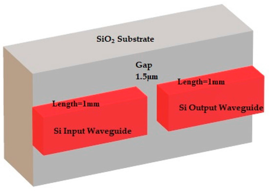 In this section, the design and modal analysis of a single mode SOI waveguide structure to operate at a wavelength of 1550 nm is presented. The SOI waveguide is designed at infrared region of light spectrum (1500–1600 nm) for single mode operation. Figure 6 shows the geometrical design details of a SOI optical waveguides with gap distance of 1.5 µm. It consists of silicon core, input waveguide and output waveguide having dimensions of 500 nm (waveguide width), height of 250 nm, and length of 1 mm. One of the important parameters used in the design is the cut-off height of the waveguide and is calculated by Equation (8) [21]: