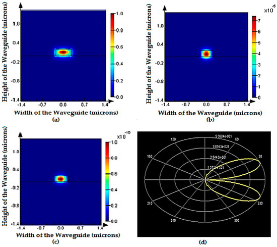 Figure 7 shows the optical mode confinement in SOI waveguide at 1550 nm. It is evident that the optical confinement of light is pronounced at the core of the waveguide (red) when compared to the evanescent wave coupling into the cladding (yellowish-green). Figure 7a,b shows electric field intensity distribution and magnetic field distribution in SOI waveguide. Energy distribution and polar plot of far field vector is shown in Figure 7c,d, respectively. Figure 7d shows the optical power propagation in the core is symmetric along z-axis with 90° of half power beam width and there are no side lobes. The absence of side-lobes indicates zero evanescent modes coupling to substrate of the waveguide structure.