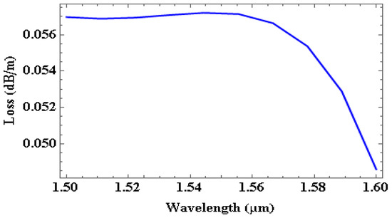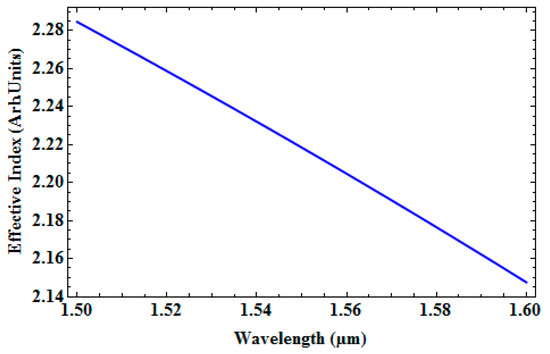 Figure 9 shows effective index as a function of wavelength and Figure 10 depicts loss as a function of wavelength in SOI waveguide for a wavelength range of 1550 nm to 1600 nm. Table 3 gives the effective index, loss in dB/cm, percentage of TE/TM fraction for the wavelengths 1550 nm, 1530 nm, 1550 nm, and 1600 nm.