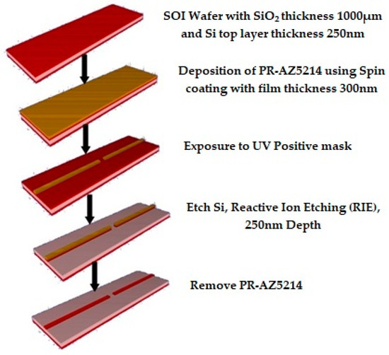 The fabrication process flow steps of the SOI waveguide structure has been simulated using Intellisense software (version 8.9, Lynnfield, MA, USA) module and is depicted in Figure 11.