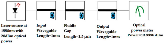 The power coupling simulation analysis has been done using the Lumerical Interconnect module. This simulation analysis has been done to prove the proof of concept and the waveguide design. This simulation setting has been carried for ideal conditions ignoring absorption and dispersion losses. The entire lab-on-a-chip structure as described in schematic representation of Figure 1, has been simulated using 1550 nm laser source with a power level of 20 dBm (100 mw). This analysis has been carried out using Lumerical interconnect simulation tool and schematic arrangement of the structure is depicted in Figure 12. The simulation is carried out by considering the input waveguide, output waveguide with a length of 1 mm, and a fluidic gap distance of 1.5 µm. The total light propagation length is 2.0015 mm. The simulated optical power output is 19.9996 dBm (is only considering mode-mismatch only). This power output is assuming ideal conditions, without any absorption and dispersion losses. The expected theoretical value of output power is (20–0.000114 dBm) 19.9998 dBm, which is calculated using SOI waveguide loss using the data depicted in Figure 10. The simulation arrangement depicted in Figure 12, results in a power output of 19.9996 dBm, which is in close agreement with the theoretical value, 19.9998 dBm. The difference in theoretical and simulated optical output is only 0.0002 dBm. This analysis was carried out to prove the concept proposed in this work.