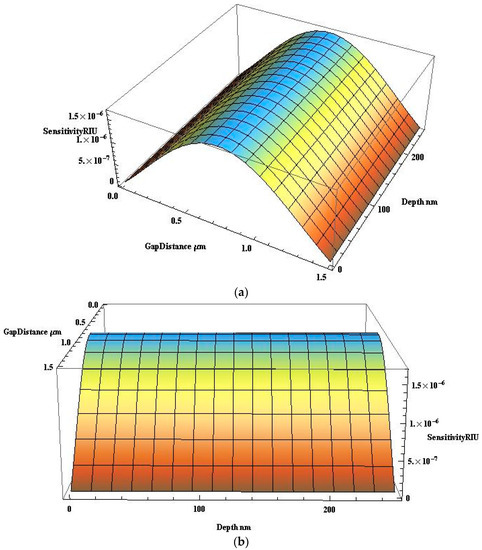 Figure 13a,b, depicts two different isometric views of the sensitivity in RIU as function of depth of waveguide and gap distance of the opto-fluidic sensor, the schematic of which is shown in Figure 6. The plot was achieved using Equation (11).