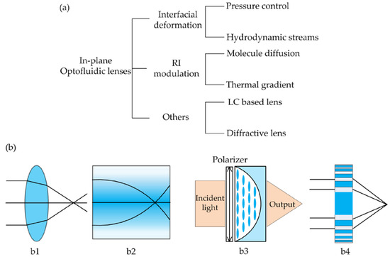Figure 1. In-plane optofluidic lenses categories and the working principles: (a) The in-plane liquid lenses are classified into three types of lenses according to their working principles; (b) schematic diagrams of the in-plane liquid lens: (b1) is the interfacial deformation lens; (b2) is RI modulation (gradient index) lens; (b3) is the liquid-crystalbased lens (LC: the blue ellipses) and (b4) is the diffractive lens (i.e., the Fresnel zone plate).