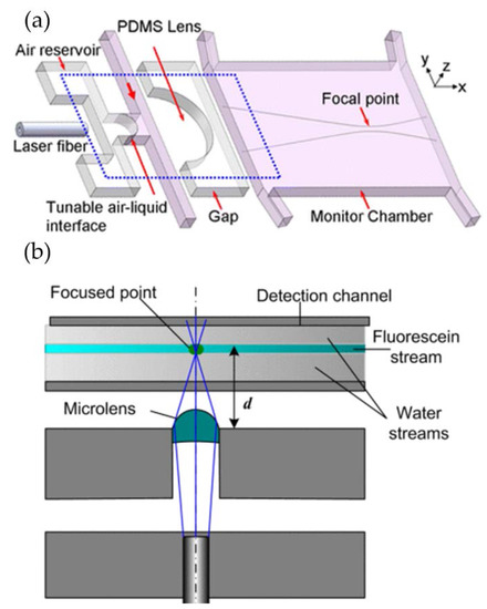 33. Tang, S.K.; Stan, C.A.; Whitesides, G.M. Dynamically reconfigurable liquid-core liquid-cladding lens in a microfluidic channel. Lab Chip 2008, 8, 395–401. [Google Scholar] [CrossRef] [PubMed]