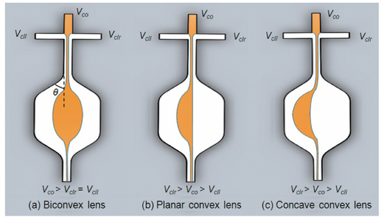 Figure 3. Different curvatures of tunable liquid microlenses via the control of laminar flow rate [36]: (a) biconvex lens; (b) plano-convex lens; (c) concave-convex lens.