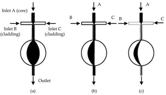 Figure 4. Reconfigurable optofluidic lenses with a circular lens chamber [37]: the lens shape is modified by adjusting the flow rates of the core and cladding streams. (a) biconvex lens; (b) plano-convex lens; (c) concave-convex lens.