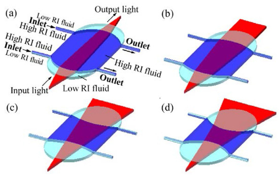 Figure 5. Hydrodynamically reconfigurable optofluidic lens, in which the liquid core (in blue) is sandwiched by the liquid claddings [27]. (a) The liquids form a biconvex lens and the beam is focused. (b) The beam is collimated when the interface curvature becomes smaller. (c,d) A biconcave lens is obtained and the beam becomes divergent.
