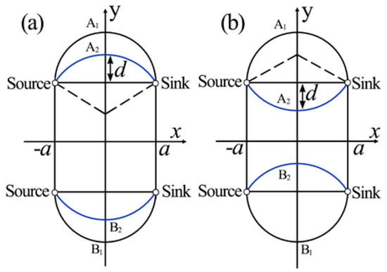 Another design of liquid lens uses the circular chamber as shown in Figure 4. Song et al. reported the modeling and experimental results of a tunable lens by injecting three laminar streams into a circular chamber [37]. The liquid-core liquid-cladding lens with perfect curvatures was formed by the circular design. Figure 4 describes the schematic design of the circular liquid lens. In the symmetric state, the lens has a biconvex shape as shown in Figure 4a. By further increasing the flow rate of inlet C, it can tune the lens into the plano-convex shape (Figure 4b) and then the concave-convex shape (Figure 4c). The curvature radius can be tuned from that of the chamber to infinity. As the width of the channel is much smaller than that of the expansion chamber, the model can be approximately described as a source-sink pair model [37]. A reconfigurable biconcave lens was demonstrated by Li et al. [38]. They used the combination of pressure driven flow and electro-osmosis to realize both focusing and diverging in a rectangle chip. Fang et al. proposed a hydrodynamically reconfigurable optofluidic lens, which can be tuned from biconcave to biconvex [27]. Figure 5 depicts the operation principle of the liquid lens. The chamber with two convex ends is used to realize the modulation from biconcave to biconvex. Two immiscible liquids with different RIs are injected into the expansion chamber, where the liquid core (with higher RI) is sandwiched by the liquid claddings (with lower RI). The curvature of the interface is modified by tuning the flow ratio of the core and cladding streams. When the cladding flow is low, the liquid core expands outside into the cladding area, resulting in a biconvex lens (see Figure 5a,b). By increasing the rate of the cladding flow, the curvature of the liquid lens decreases. With the further increase of the cladding flow, the liquid core is compressed into a biconcave shape and the lens becomes negative, as shown in Figure 5c,d. The modulation from biconvex (positive) to biconcave (negative) lens has been demonstrated by adjusting the flow rate. They proposed a two-dimensional quadrupolar flow model to analyze the operation of the liquid lens [27]. As shown in Figure 6, the model has two sources at the left side and two sinks at the right side. The sources and sinks were regarded as dimensionless points. By combining the flow model and the theory of thick lens together, an equation was derived to describe the focal length: