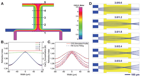 A simple method to form a RI gradient within liquid medium is solute diffusion. In a laminar flow inside the microchannel, the concentration gradient is determined by the solution diffusion [45], which can be modulated by the flow rate control. Therefore, a graded RI profile can be achieved using the solution diffusion. Yang et al. proposed an optofluidic RI gradient for lightwave bending and manipulation through the diffusion between ethylene glycol and deionized water [19], in which the RI can be tuned from 1.34 to 1.42. Mao et al. demonstrated a reconfigurable liquid gradient index (L-GRIN) lens with two degrees of freedom using CaCl2 solution as the core and deionized water as the cladding [28]. As shown Figure 7A, the two liquids (the CaCl2 solution and DI water) are injected into the microfluidic chip to establish the gradient profile by diffusion of laminar flows. The rays bend gradually when they meet the RI gradient. Tuning the flow rates of the liquids enables not only to change the focal length, but also to shift the focused beam away from the optical axis, providing another freedom for adaptive optics. Figure 7B depicts the RI distribution along lines 1–5. The RI profile inside the channel follows a hyperbolic secant (HS) function as