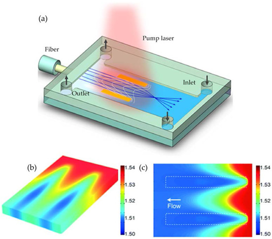 Figure 9. Optofluidic thermal lens using laser-induced thermal gradient [29]: (a) schematic design; (b) 3D and (c) 2D RI profiles.