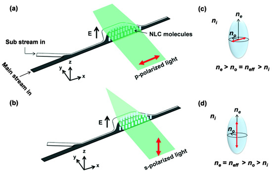 Wee et al. demonstrated an in-plane optofluidic birefringent lens by manipulating the streams of a nematic LC and an isotropic liquid under an external electric field [31]. Figure 10 shows the schematic design, in which the nematic LC and the isotropic liquid are used for the main stream and the surrounding sub-streams, respectively. When an external electric field is applied in the direction perpendicular to the substrate, the LC molecules are reoriented along the electric field, resulting in the birefringent effect in the liquid layer. As ne and no have different values in the nematic LC, the RI difference (i.e., the RI contrast on two sides of the interface) is dependent on the polarization state of the incident light. For the p-polarized light, the effective index equals to no, which is smaller than ne. Therefore, the RI contrast (Δn = neffni) of the p-mode is smaller than that of the s-mode. As a consequence, the s-mode has a smaller focal length (see Figure 10b) than that of the p-mode (Figure 10a). This new type of hydrodynamic optofluidic lens can be modulated by either the flow rate or the polarization of the incident light.