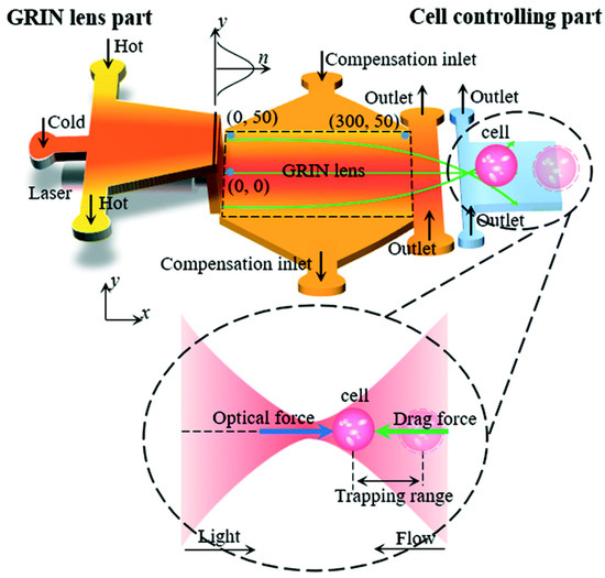 30. Liu, H.L.; Shi, Y.; Liang, L.; Li, L.; Guo, S.S.; Yin, L.; Yang, Y. A liquid thermal gradient refractive index lens and using it to trap single living cell in flowing environments. Lab Chip 2017, 17, 1280–1286. [Google Scholar] [CrossRef] [PubMed]