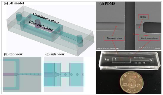 The schematic diagram of the semi-3D flow-focusing microfluidic device is illustrated in Figure 1a–c. The practical monolithic device and structures of PDMS slab under SEM are shown in the Figure 1d. The channel height of the dispersed phase and the orifice is narrowed by 6 times compared to the height of the continuous phase and the downstream channel. As a result, the dispersed phase flow is sheared by the continuous phase liquid from all directions. In addition, the width is enlarged by 2 times compared to the orifice. The hydraulic resistance (R) of the dispersed phase channel is larger than both the continuous phase channel and outlet channel (the orifice and downstream channel) in the design of the channels, while R of continuous phase channel is smallest. The R for the rectangular microchannel is calculated according to the following formula []: