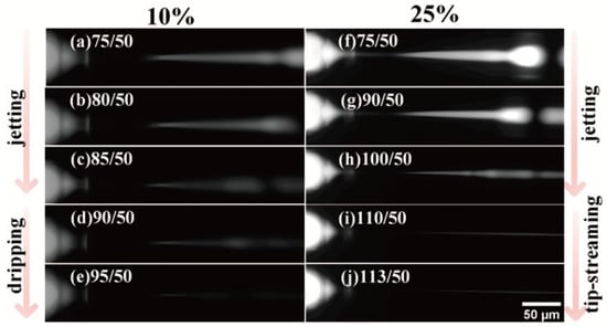 Representative fluorescent images of the transition of droplet breakup processes at bulk concentration of surfactant of 10 vol % and 25 vol %, including (a–d,f–h) jetting mode, (e) dripping mode and (i,j) tip-streaming mode.