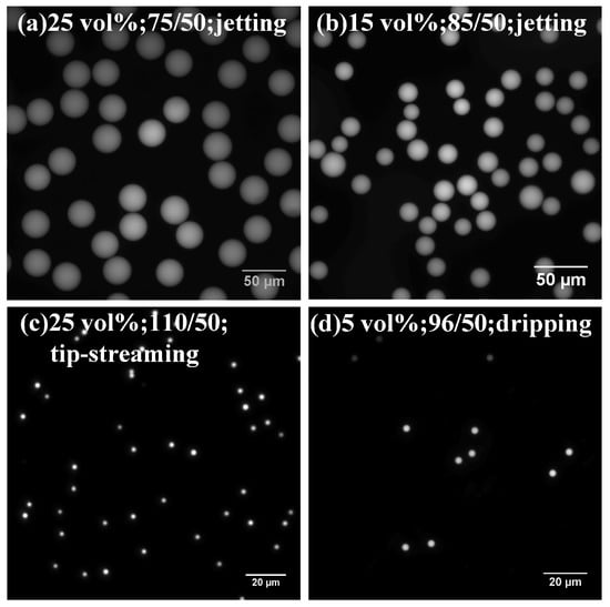 Figure 3 shows the representative fluorescent images of the transition of droplet breakup processes, and the video of breakup process is shown in the Supplementary Materials (Video S1). The bulk concentration of surfactant changes from 5 vol % to 25 vol %, and the pressure ratio (the pressure of continuous phase (P): the pressure of dispersed phase (P)) changes from 1.4 to the ratio that makes the dispersed phase flow break off. For our experimental system, the experimental result shows that the PEGDA droplet is generated in the jetting mode at the beginning, whatever the bulk concentration is. The dispersed phase flow extends beyond the orifice and resembles a long jet. When the bulk concentration of surfactant is 5 vol % and 10 vol %, the emulsion breakup mode will change from jetting to dripping mode. The dispersed phase liquid cone breaks into discrete droplets at the cone tip. However, when the bulk concentration of surfactant exceeds 15 vol % (including 15 vol %, 20 vol % and 25 vol %), the transition from jetting to tip-streaming mode occurs. A very thin liquid thread forms from the end of the stable conical tip, and the discrete droplets cannot be observed at a frame rate of 690. Five pressure ratios of transition are recorded in the Table 1.