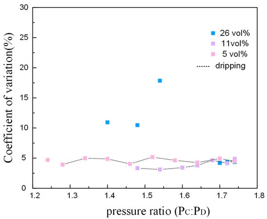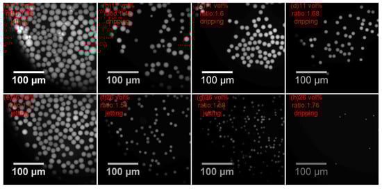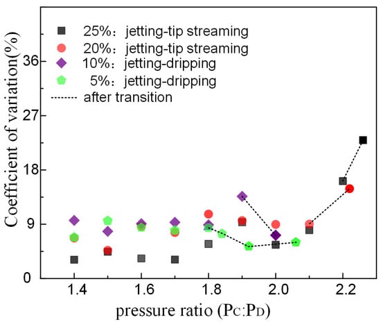 The droplet CV is plotted as a function of the pressure ratio, showing in Figure 9. The surfactant has more influence than the pressure ratio in the droplet uniformity. The CV of ETPTA droplet is higher under the jetting mode. In other words, the uniformity is lower under the jetting mode than the dripping mode. However, the pressure ratio and surfactant concentration both have no significant impact on the CV under dripping mode. The uniformity is lower under the jetting mode than the dripping mode. When the pressure ratio is close to the pressure ratio of transition, the more volatile dispersion of the jet causes lower droplet uniformity (Figure 10g), and the dispersion of ‘tail’ also bring on higher CV under dripping mode (Figure 10b). When the flow rate increases as the pressure ratio increases, the discrete state of ‘tail’ is improved, leading to higher droplet uniformity (Figure 10c,d,h).