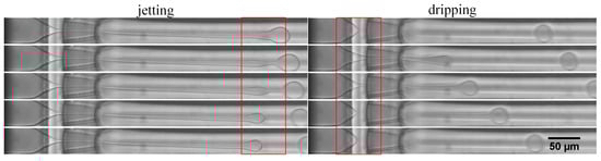 The trimethylolpropane ethoxylate triacrylate (ETPTA) droplet formation process through jetting and dripping mode. The bulk concentration of surfactant is 5 vol %.