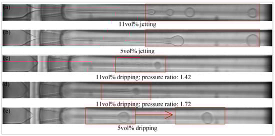 Different bulk concentrations of the surfactant lead to differencea in droplet formation, both under jetting and dripping mode. The droplet uniformity clearly becomes worse with increasing surfactant concentration, which is illustrated in Figure 7. When the ETPTA droplet is generated in the jetting mode, the jet tip is more volatile and breaks into smaller droplets of varying sizes for 11 vol % (Figure 7a). When the ETPTA droplet is generated in the dripping mode, the ‘little tail’ of ‘tadpole’ will dissociate droplets in different sizes for 11 vol % (Figure 7c), but, the discrete situation does not occur under faster flow when the pressure ratio increases (Figure 7d). However, the ‘tail’ will gradually merge with the main droplet and there will generate only one droplet at 5 vol % (Figure 7e), as seen in Figure 7d. Videos S2 and S3 in the Supplementary Materials display that the ETPTA droplet generates for 5 vol % and 11 vol % under different pressure ratio.