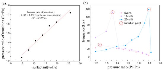 The pressure ratios for transition from jetting to dripping mode under different surfactant concentration are shown in Figure 8a. The relationship between pressure ratio of transition and surfactant concentration is estimated with a linear fit. Higher surfactant concentration leads to higher pressure ratio for transformation. In other words, the dripping mode happens more easily with lower surfactant concentration. Furthermore, the differences in the formation frequency also reflect the transition from jetting to dripping. Image analysis reveals the droplet formation frequency for different pressure ratio and surfactant concentration, which are plotted as a function of the pressure ratio in Figure 8b. It can be observed that the generation frequency increases as the pressure ratio increases under jetting mode. When the jetting mode transforms to dripping, frequency declines sharply and immediately (excepting 5 vol %), then gradually decreases with increasing pressure ratio.