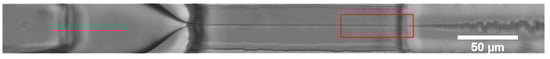 To get a better observation for tip-streaming process, deionized water is used as the dispersed phase liquid and a longer orifice is designed, because deionized water and hexadecane can be form a clear interface of liquid-liquid, and deionized water significantly reduces the difficulty to form the stable tip-streaming mode. Figure 11 and Video S4 in the Supplementary Materials show the tip-streaming mode. It is worth noting that fast dripping occurs at the end of the orifice, between dispersion positions of the jetting mode and dripping mode. Smaller droplets are generated at a high production rate.