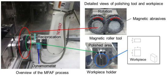 As shown in Figure 2, the experimental setup mainly consists of a dual magnet roller tool, a 6 degrees of freedom (DOF) robot arm, a dynamometer, as well as a workpiece mounting fixture. The dual magnetic roller design was adopted to generate the magnetic field. It was designed in a manner that exhibits differential magnetic flux densities at various target positions around the rollers, enabling a reforming mechanism of the magnetic abrasives at each revolution [25]. It was attached to 2 rotary motors that provide a controlled variable speed motion up to 1800 rpm. The magnetic abrasives accumulated between the two rollers were used as the polishing tool to remove material from workpiece surface. The use of the robot arm enables the use of a programmable work path to reach non-planar workpiece profiles. The detailed conditions used in the experiments are listed in Table 1. The workpieces were cut into a dimension of 30 mm × 30 mm × 15 mm by wire-cutting, followed by surface preparation for target initial conditions via wire electrical discharge machining (EDM) with an initial surface roughness Ra over 3.0 µm. The rotation speed of the dual magnetic roller tool was set to 400 rpm while the robot arm fed at a speed of 288 mm/min (40% of the maximum speed) vertically with a reciprocation distance of 60 mm. The gap between the roller and the workpiece was set to 1.5 mm. The center part of workpiece surface was polished. The force exerted by the magnetic abrasives on workpiece surface was about 20 N which was measured by the dynamometer.