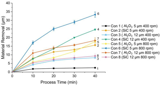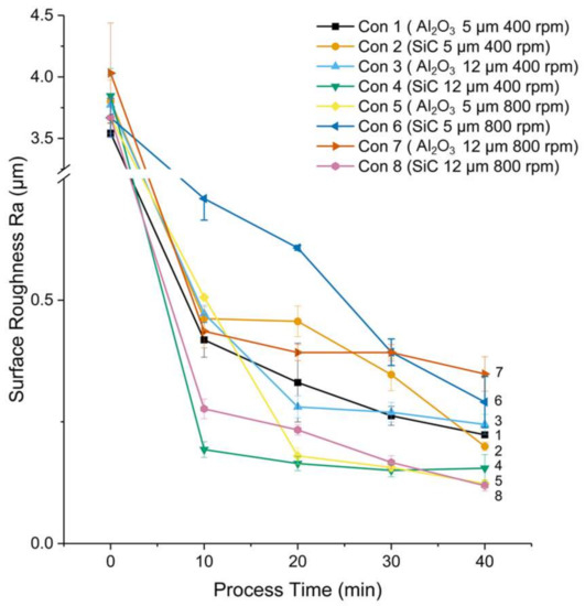 Material removal increased with the increment of polishing time (see Figure 4). At the polishing speed of 400 rpm, it is found that the type of SiC-based magnetic abrasives produced a higher material removal than that of Al2O3-based magnetic abrasives, and large particles contributed to a higher material removal. However, at the polishing speed of 800 rpm, due to the high rotation speed, large particles became susceptible to being scattered and dropped out from the abrasives. Due to such an experimental observation, the reduced volume of the SiC and Al2O3 particles in turn resulted in a lowered material removal. It should be noted that the material removal of “Con 1” increased a little bit but not stopped. Plowing or burnishing effect may happen but need to be further confirmed. Therefore, for the Al2O3-based magnetic abrasives, particle sizes of 5 µm and 12 µm achieved similar material removal after 40 min polishing. For the type of SiC-based magnetic abrasives, material removal by particle size of 12 µm was much lower than that by particle size of 5 µm.