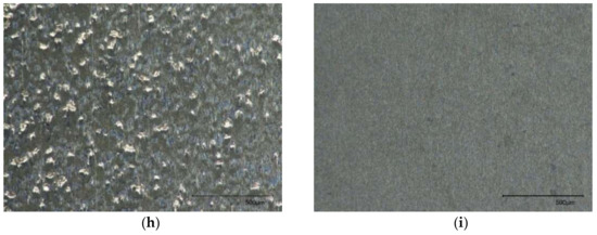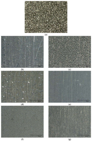 Surface morphologies of (a) unpolished surface as prepared by wire EDM and (b–i) polished surfaces by test conditions of 1–8. (The scale bar is 500 µm in length).