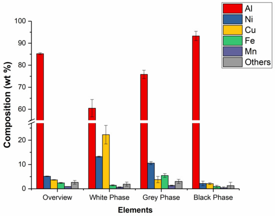 The elemental composition of the sample was analyzed by energy dispersive X-ray (EDX) measurement at 5 different locations for the respective phases and the overview taken at 50× magnification. The elemental compositions were charted in Figure 7. Among the 3 phases, the black phase is mainly composed of Al with a weight percentage of over 90%, while the white phase had the lowest weight percentage of Al composition around 60%. The white phase contained relatively higher amount of Ni and Cu, and the grey phase contained relatively higher amount of Ni and Fe, which implies that the white and grey phases should have a higher hardness.