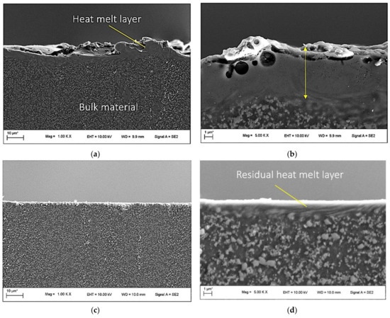 With the aim of evaluating the influences of wire EDM and MFAF processes on the subsurface of RSA 905, the cross sections of the edges were examined. As shown in Figure 8a,b, after wire EDM, an uneven heat melt layer of a maximum thickness about 10 µm was formed on the sample surface. After MFAF under the condition of Test 3, as the material removal was less than 10 µm, the heat melt layer was not completely removed with a remaining depth of 1–2 µm. Under the condition of Test 5, the layer was completely removed without inducing new damages such as deformed layer or cracks.