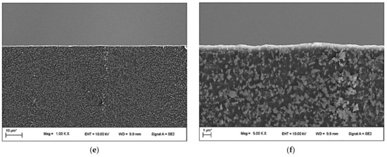 The cross-sectional views of edges before polishing at (a) 1k× magnification and (b) 5k× magnification, after polishing of sample 3 at (c) 1k× magnification and (d) 5k× magnification, and after polishing of sample 5 at (e) 1k× magnification and (f) 5k× magnification.