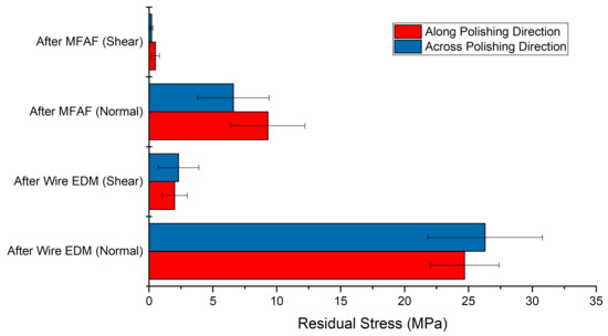 To evaluate the surface and subsurface quality from another aspect, the respective surface residual stresses after wire EDM and after polishing using test sample 5 were measured using an X-ray Diffractometer (XRD). The penetration depth of X-ray in sample surface was about 80 µm. As shown in Figure 9, it is found that, both normal (perpendicular to the sample surface) and shear (parallel to the sample surface) tensile stresses were released after MFAF process. The normal stresses were reduced by over 50%, and the shear stress became almost zero. Although the values were not absolute, according to the results of cross-sectional observation, it can be concluded that the surface residual stresses were almost fully released.