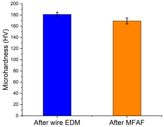 The surface microhardness before and after polishing was also tested using a micro-Vickers hardness tester at 5 different locations. The applied load was 100 gf. As shown in Figure 10, the results indicated that the heat melt layer hardened the surface, and the microhardness was slightly reduced after MFAF from about 180 HV to 170 HV. The changes in microhardness are consistent with the results of residual stress release.