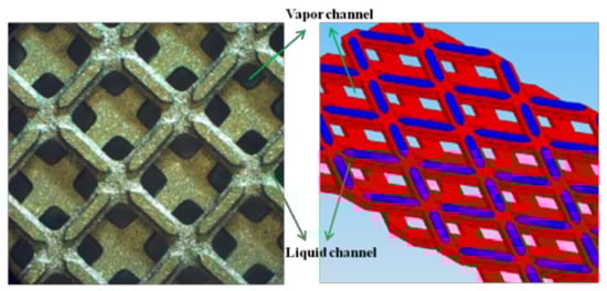 It is known that processing gases and liquids together in microchannels having at least one dimension <1 mm has unique advantages for rapid heat and mass transfer. One approach for managing the two phases is to use porous structures as wicks within microchannels to segregate the liquid phase from the gas phase. At the Pacific Northwest National Laboratory (PNNL), gas-liquid processing is accomplished by providing a gas flow path and a separate flow for the liquid phase through the wick under an induced pressure gradient [17]. These microwick technologies enable a variety of applications including phase change, heat exchange, phase separation, partial condensation, absorption, desorption, and distillation [18,19,20]. New wicking structures are being developed at PNNL that are capable of wicking liquid and accommodating vapor flow in the same space [21]. These structures are referred to as ‘dual-mode’ wicks because they display multiple time scales and length scales in wicking fluids (Figure 1). These porous structures enabling wicking evaporators displayed boiling heat transfer enhancement [22]. The interwoven liquid and vapor paths in dual-mode wicks facilitated phase segregation and suppressed or delayed dry out of heated surfaces. Experimental results showed heat transfer coefficients exceeding 20,000 W/m2 K. Other characteristics demonstrated in [22] include reduced pressure fluctuations, and lower superheat requirements when compared to plain channels.
