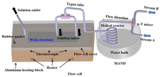 The schematic diagram of the MAND system with the flow cell is shown in Figure 2. The MAND system mainly consists of a micro T-mixer (Upchurch Scientific Inc., Oak Harbor, WA, USA) to enhance mixing of the reactants, a helical reactor made by wrapping a 5 ft long Tygon ST tubing (1.2 mm ID, Upchurch Scientific) around a cylinder, and a water bath to adjust reaction temperature. A flow cell made of an aluminum block was specifically designed to accommodate the microwick structure for the deposition. Three cartridge heaters were embedded in the flow cell to provide uniform heat distribution, and heat flux was controlled by a variac. Reaction temperature during the deposition was monitored by three thermocouples placed nearby the deposition area. The temperature variation was interpreted via LabVIEW software (LabVIEW 8.5, National Instruments (NI), Austin, TX, USA). The cover was made of a transparent polycarbonate material that allows for the observation of the deposition process. The flow cell was tightly sealed with a rubber gasket and clamps to prevent any possible leaking of solution. Three holes on the cover provided two inlet streams and one outlet stream for the solution flux.