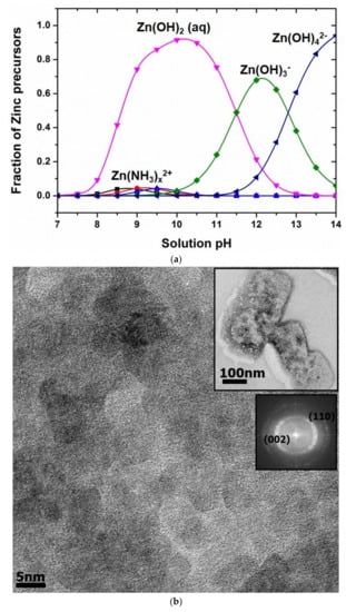 (a) speciation diagram of Zinc precursors; (b) TEM image of ZnO nanocrystals assembled to form rectangular structure in the MAND system (inset: TEM image of rectangular ZnO assembly and FFT image of assembled ZnO nanocrystals).