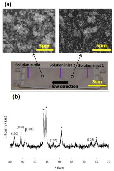 The reactants, zinc acetate (Zn(CH3COO)2·2H2O, Sigma Aldrich, St. Louis, MO, USA), ammonium acetate (CH3COONH4, Mallinckrodt Chemicals, St. Louis, MO, USA), and sodium hydroxide (NaOH, Mallinckrodt Chemicals, St. Louis, MO, USA), were used as received without further purification. For the ZnO nanocrystal synthesis and the deposition of ZnO nanostructures on the microwick shim, stream A composed of 0.005 M zinc acetate and 0.25 M ammonium acetate solution and stream B (0.05 M NaOH) were initially pumped into the Tygon tubing and allowed to mix homogeneously in a micro-T-mixer. The solution mixture of A and B then passed through a 5 ft long helical structured reactor. By immersing the reactor in the water bath, the reaction temperature (70 °C) was maintained throughout the growth process. The solution exiting from the helical reactor entered another T-mixer where one stream solution was divided into two streams to equally feed reacting solution onto the large scaled microwick structure. The solution then passed through the flow cell maintained at constant temperature (70 °C). ZnO nanostructures were deposited onto the microwick structures as the solution flowed over the microwick structure. The solution flowed out through the outlet port. Deionized water (DI) water was used throughout the experiment and vigorously degassed to remove dissolved air prior to the deposition. The vigorous degassing process is necessary to prevent bubble creation during the deposition, which would increase the pressure drop inside the flow cell and cause irregular deposition. Flow rate of the solution adopted for the nanostructure deposition was 14.7 mL/min.