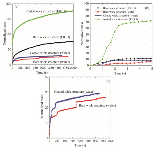 Figure 5 exhibits the capillary rise obtained by the mass gain approach. Both bare wick structure and ZnO coated wick structure were tested with the use of water and EtOH to demonstrate the enhanced capillary rise of the ZnO coated wick structure. It should be noted that mass uptake plotted on the vertical axis is normalized with dry weight of the wick. It was observed that the capillary rise of the coated wick structure is enhanced for both working liquids, as compared to that of the bare wick structure. The nanostructure coating effects on the capillary rise are more pronounced when EtOH is used as the working liquid compared to water. Thus, the most efficient capillary rise can be obtained using the coated wick structure with EtOH. The capillary rise phenomenon is governed by multidisciplinary factors including physical properties of the working fluid, structure of the wicking substance, and interaction between working fluid and wicking substance. In typical, wettability of the working fluid on the surface plays an important role in determining the capillary rise according to the formulation of the capillary force. The static contact angle of EtOH on the coated microwick structure is lower than that of water, which could be a primary factor to cause the capillarity difference between EtOH and water (inset in Figure 6). The capillary rise at initial contact regime is shown in Figure 5b. Wicking rate of the coated wick structure in EtOH is about ×7 larger than that of the bare wick structure. Wicking rate is an important characteristic in filling the liquid into porous media particularly for absorbing technology [34]. The enhanced wicking performance of the coated wick structure clearly indicates that the nano- or micro-pores as well as improved wettability generated by the flower like ZnO nanostructures propels the working fluid more effectively as compared to the bare wick structure. More details on capillary rise of the ZnO coated microwick structure will be discussed later in the mechanism study.