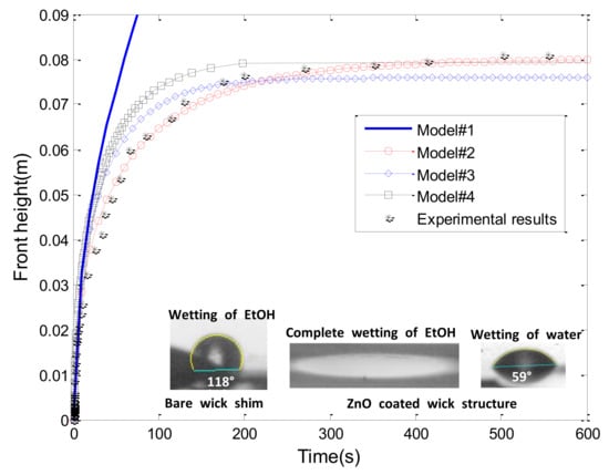 We confirmed the enhanced capillary rise of EtOH in the ZnO coated wick structure. In order to investigate the mechanism of its wicking rise, we carried out the height measurement capillarity of EtOH in the ZnO coated wick structure and compared the resulting measurement with analytical models. Figure 6 shows temporal evolution of the capillary rise height of EtOH for nanocoated microwick structures. The capillary rise height reached a steady state of about ~500 s. The equilibrium height at the steady state was 80 mm. In order to investigate the parameters that affect the capillary rise of the coated wick structure, the height measurement result is compared with the analytical models as shown in Figure 6. Several analytical models have been proposed to predict the capillary rise and widely used to investigate the wicking process of regular or irregular porous systems.