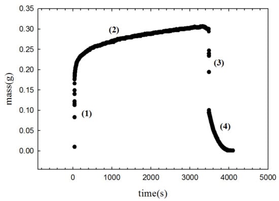 Mass gain approach of the coated wick structure in EtOH; (1) wetting regime; (2) wicking regime; (3) de-wetting regime; and (4) evaporation regime.