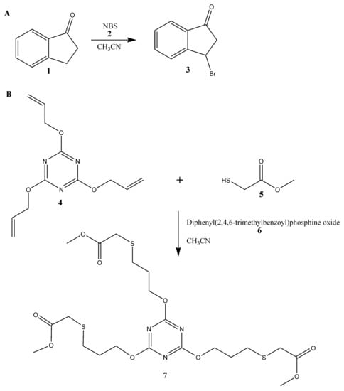 Substrates for organic synthesis: 1-indanon, N-bromosuccinimide, 2,4,6-tris(allyloxy)-1,3,5-triazine, methyl mercaptoacetate and diphenyl(2,4,6-trimethylbenzoyl)phosphine oxide were bought from Sigma-Aldrich (St. Louis, MO, USA) and used as received, without additional purification. Acetonitryle (HPLC grade) was bought from POCh S.A. (Gliwice, Poland).