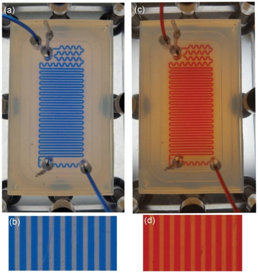 Visualization of the flow of EtOH with Oil Blue (a,b) and PrOH with Red Oil (c,d) in the photoreactor made of FEP. The photoreactor is placed between the holder made of 10 mm PC plates and compressed with M6 screws (visible at the edges of the pictures a and c). The flow of the organic solvents is 3 mL·h−1 which is typical for organic synthesis in microscale. There is no outflow of EtOH or PrOH outside the chip or to the mortise. The light color between main channels is a result of a thin layer of solvents between the two FEP plates (pictures b and d) due to capillary forces.