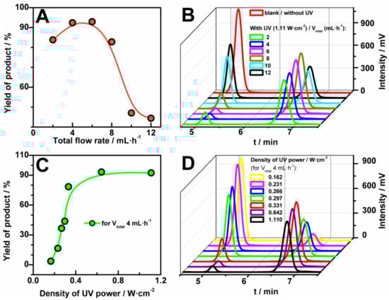 In turn, a higher flow seems to reduce the time of the reaction, giving a significant decrease of the HLPC signal (Figure 5A). Furthermore, the bromination reaction was investigated for different values of power density of UV source—from 0 W·cm−2 to 1.11 W·cm−2. In Figure 5C, the yields of product versus the applied UV energy for the fixed flow rate, 4 mL·h−1, were plotted. The yield of the reaction increased very quickly with the increase of the UV power up to 0.5 W·cm−2, whereas after the value a steady-state stage was reached.