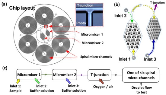 The bioluminescent cell-based optofluidic device for toxicant detection in water environment. V. fischeri is used as the toxicity indicator based on inhibition of luminescence; the device is designed to work continuously and shows high potential for home usage. (a) The optofluidic chip is composed of two counter-flow micromixers, a T-junction droplet generator, and six spiral microchannels; (b) two counter-flow micromixers and the flowing direction and mixing process; (c) the function of the different microstructures on the optofluidic chip [39].